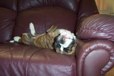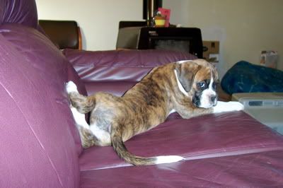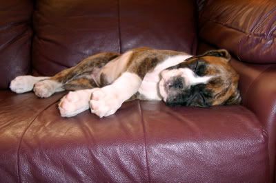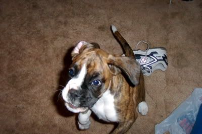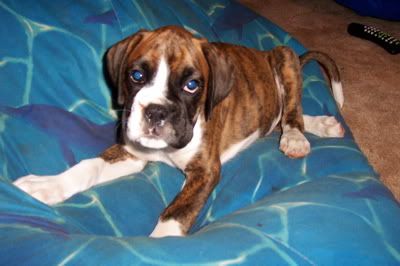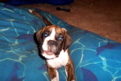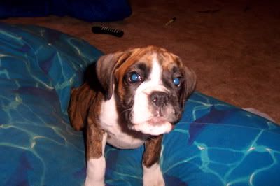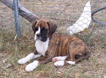 Aroura Posted April 13, 2005 Posted April 13, 2005 As promised I am posting more updated photos of Merlin, with an update, of course :wink: Well he is turning out to be quite a clever little cookie! His "come"s are rock solid, he learnt to sit in about a minute, more clever still he learnt to speak on command in about five, then learnt to "bounce" also in just a couple of minutes - it is very rare for a pup to learn so quickly through pure shaping! I can see that he will probably excell in obedience, agility and in the show ring, such a special little pup! He is putting on a steady 200g every day, and he is getting quite heavy now! Soon I wont be able to carry him around! He is goint to be a big boy when he grows up. I took him to the vet the other day to check his testicles (only one had dropped) and the other had come down, so I was very happy about that :D Anyway, enough with the chit chat, I know what you're all waiting for - PHOTOS!!! :angel: This first one is of Merling snoozing, in the typical "Boxer position" Here he is, sleeping sweetly And posing for the camera - this is my favourite Looking gorgeous Speaking on command About to speak, but looking more like he is reaching forwards to give me a kiss Bouncing This last one was taken this morning, if you look at it in comparison to the first three taken a few days ago you will see how fast he is growing! Isn't he just adorable? Quote