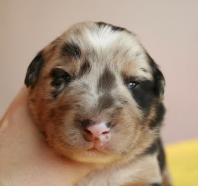 Aussie Posted March 18, 2010 Posted March 18, 2010 To i ja wstawię zdjęcia "paszportowe" moich dwutygodniowych maluszków :-) Według stopnia otwarcia oczek: Suczka nr 2 - Baba Piesek nr 3 - Smok Piesek nr 2 - Pan Połówka Piesek nr 1 - Pierworodny Suczka nr 1 - Ogoniasta Piesek nr 4 - Hayden, który jako jedyny jeszcze oczek nie otworzył, co nie przeszkadza mu w byciu jednym z najruchliwszych maluchów ;) Ciekawe, że najszybciej otworzyły oczy najmocniejsze szczeniaki. Ale Hayden bynajmniej nie jest najmniejszym ani najdrobniejszym... Quote