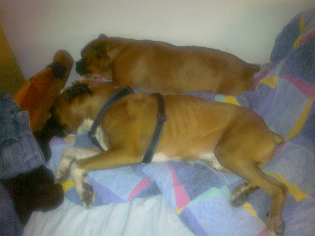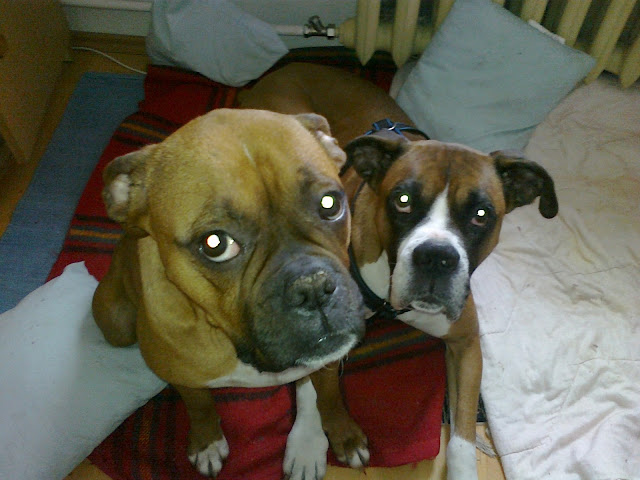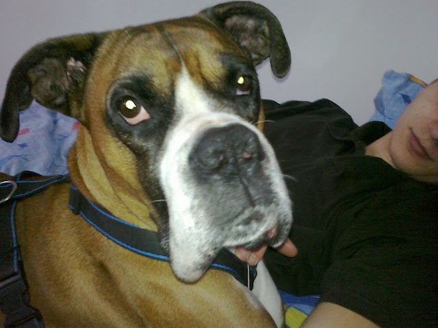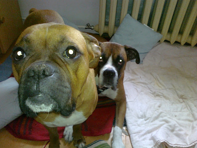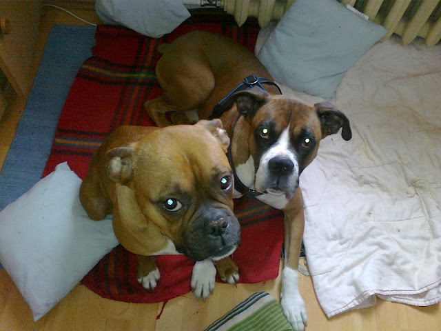 babaj Posted February 15, 2010 Posted February 15, 2010 Jeszcze wczoraj (znaczy już dziś) Denis stanął przed łóżkiem, nic nie mówił, tylko popatrzył. Mówię: - Kaja nie przesadzaj - nie mogę, popatrz na niego, na jego minę. i stało się - straciłem miejsce na swoim legowisku. Zajął centralne miejsce łóżka, liczyłem na to, że jak już to w nogach. Drugi minus dodatni, znalazłem w maśle włos, włos psi. No cóż posiadanie psa to nie tylko przyjemność, ale i obowiązki oraz pewne niedogodności, które trzeba polubić, a jak się nie do to chociaż tolerować. Szczotkowanie, wyczesywanie Czy boksery się wyczesuje, szczotkuje? Sierść ma bardzo ładną, ale przy głaskani trochę zawsze wychodzi. Jeśli tak, to czym (grzebieniem, szczotką, jaką szczotką)? Wczoraj jak wstałem od komputera (od forum), Denis w tym czasie spał na kanapie, ale zaraz wstał i poszedł tam, gdzie są ludzie, czyli do naszego pokoju. Żona zaprosiła go na łóżko, a ja poszedłem zjeść kolację (śniadanie). Jak wróciłem. Denis już spał i to dość twardo, musiałem się trochę powiercić, żeby wygospodarować sobie trochę miejsca i kołdry. Chyba się nie obudził. Rano jak się obudziłem spał już u siebie. Chyba mu się za ciepło zrobiło, albo go skopaliśmy. Chrapania, nie słyszałem, żona też nie. Podpowiada mi tu przez ramię, że jak zasypiał to troszkę po chrapał. Dziś rano zajął to samo miejsce: Psa się uczymy, dziś rano żona popełniła faux pas. Spotkanemu psu i jego Pani opowiadając wczorajsze zdarzenie użyła słów "Denis ugryzł koleżankę", nie wspomniała, że chodziło o bokserkę. Pani była bardzo zaniepokojona. Niestety za późno zorientowała się, że nie została właściwie zrozumiana ;) Denis dał głos Wracałem ze sklepu z chlebem i zamiast wejść - zastukałem. Zanim Denis się zorientował, że to ja rozległ się jego pierwszy szczek u nas. To chyba dobry znak. Oczywiście od razu jak podbiegł do drzwi i zorientował (wywąchał), że to ja zaczął merdać i witać się. Sprawa kości Nurtuje mnie jeszcze. Ja mam pełną świadomość faktu, że moja wiedza opiera się głównie na ludowych przekonaniach, a więc... Słyszałem, że pies powinien jeść kości, bo one są źródłem czegoś tam (wapna?) Słyszałem również, że dla psów kości drobiowe są niebezpieczne ze względu na to, że złamane są bardzo ostre. Do tego stopnia, że mogą uszkodzić jelita. Soema wyraźnie mówiła, że Denis ze względu na swoją historię u niej nie dostawał kości, żeby mu nie dawać. Korci mnie, żeby dać szyję, skrzydełko to już nie wiem. Dziś żona przepuściła przez maszynkę do mięsa kości z wczorajszego pieczonego kurczaka, wyglądają tak: Czy w takiej postaci dosypać mu trochę do michy? Ten szpik tak apetycznie wygląda... Czy to wszystko mity i kości dla psów są nie strawne? A czy jakiejś dużej kości (nie takich od schabu, ale coś co go trochę zajmie) nie należałoby mu kupić czasem? Quote