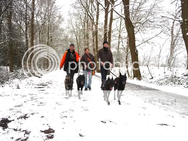 Faktycznie jakos tak sie zlozylo, ze prawie wszystkie w uprzezy z odblaskowymi paskami. I z napisami: Edor paraduje z napisem SECURITY, Lizzy z HOLLANDSE HERDER, Kcerka z PRETTY GIRL, Doerak z MACHO... itd. Tylko dlugowlose jakos nie lubia chodzic w szelkach.