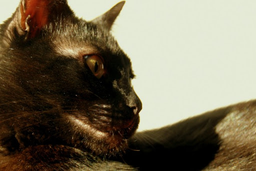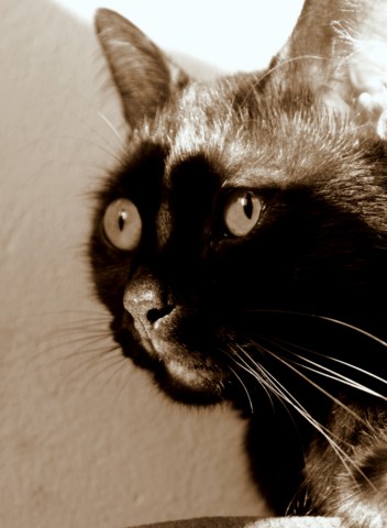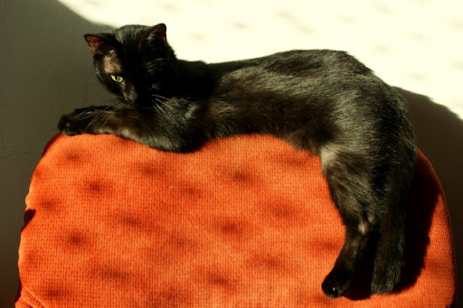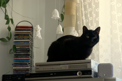 Teraz siedzę ja na fotelu, mam na kolanach laptopa, a pomiędzy mną, a laptopem, na moim brzuchu leży Magik zwinięty w kulkę, grzeje się przy komputerze. :D