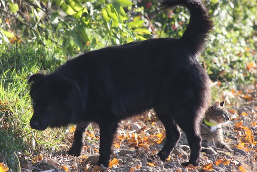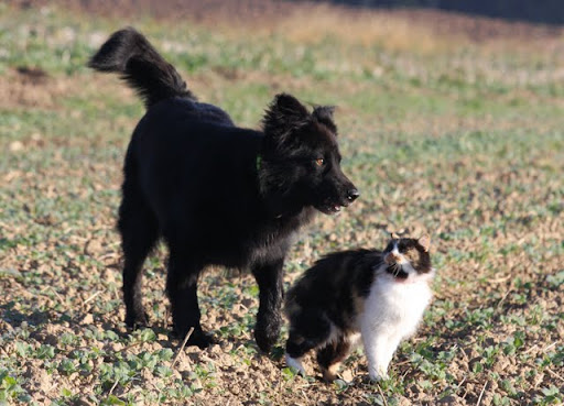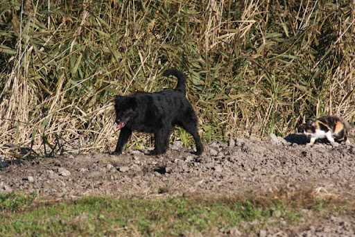 Z kotami jest tak. Jesteśmy na spacerze, jak zobaczy kota to biegnie że aż się kurzy. Kot oczywiście nie ucieka, więc jak dobiegnie to jeszcze tyknie nosem mówiąc - no dawaj, rusz się. A kotki ocierać się zaczynają - no to już daje sobie spokój.