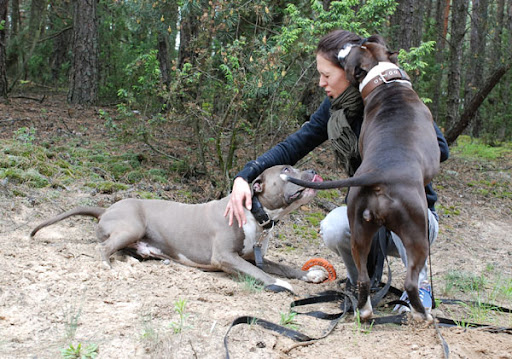doddy Posted May 15, 2010 Author Posted May 15, 2010 Psiaki w lesie czuły się wyśmienicie. 10 metrowe linki nie były dla nich przeszkodą do świetnych zabaw z nami, ze sobą. Przy okazji sprawdziliśmy, że Clyde jest bardzo zorientowany na człowieka, przychodzi na zawołanie, uwielbia zabawy (w tym jest niestrudzony i choćby miał się czołgać będzie chciał się nadal bawić). Psy mają świetną kondycję. Bonnie jest mniej wylewna, ale jak już zobaczy, że się siada, to przychodzi na przytulanie i wtedy jest przeszczęśliwa. Clyde oczywiście nie stoi z boku, więc ma się na sobie oba psy. Quote