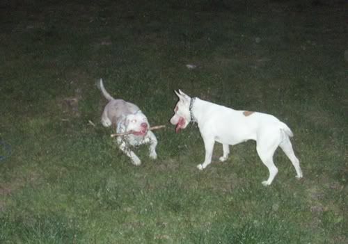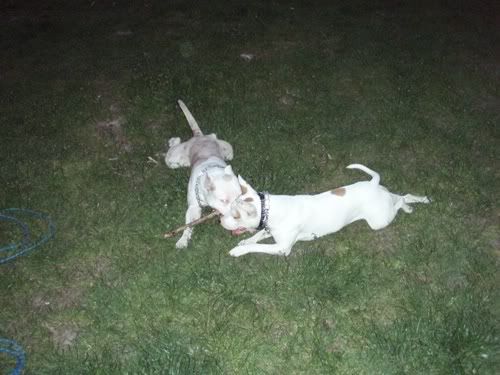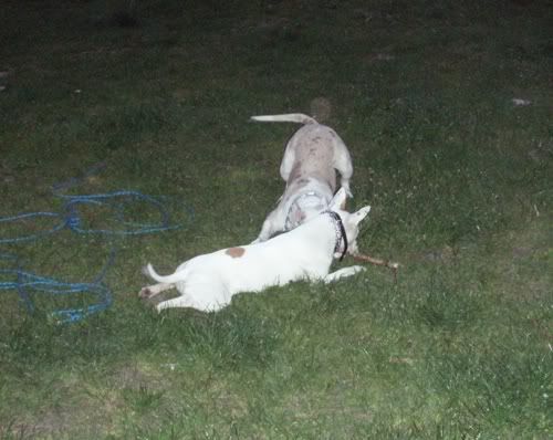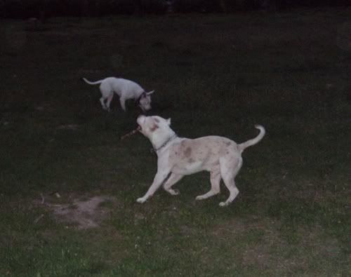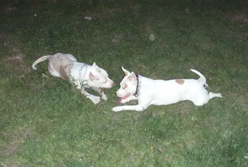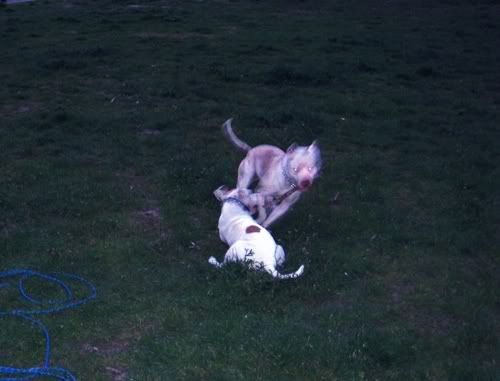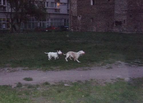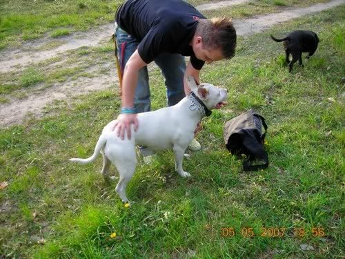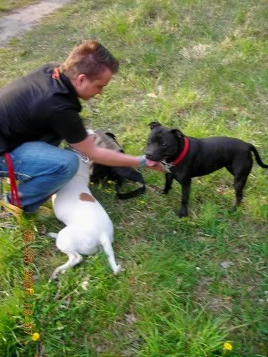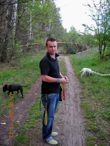 Dag Posted April 24, 2007 Posted April 24, 2007 No dobra Vectra... z Tobą przegrywam...:oops: Świnie na sępa: Chruma bez zmian, Piga podirytowana: Chruma dalej bez zmian: Chruma bez zmian, Pigi patrzy podejżliwie... spadnie panci na podłogę ten wafelek, czy nie spadnie... Zabrałam Piguśke na godzinny spacer i spotkałyśmy JEGO:loveu: , jedynego, cudownego, przystojnego Dodge'a (czyli po mojemu Dodża), który podobno jest pitbullem, ale nic to...:razz: . Dodż jest jedynym psem, który bez protestów wytrzymuje delikatne zabawy Piguni, nie ma nic przeciwko temu, że Pigusia co chwila próbuje go przewrócić klatą, że włazi mu na łeb, galopuje po grzbiecie i szarpie za uchi. Dodż, który jest bardzo ładnie wychowanym, grzecznym dwulatkiem kocha Pigę do tego stopnia, że na jej widok nic innego sie nie liczy, zapomina o sikaniu, wąchaniu i słuchaniu panci/pancia, ciągnie jak oszalały i piszczy. Zdradza ją co prawda z goldenką, tzn na widok goldenki reaguje tak samo, ale trzeba mu przyznać, gust ma niezły, a Pigusia i tak goldenką później wyciera wszystkie kałuże, więc równowaga zachowana.:evil_lol: Piguśka najpierw była na 20m lince, ale że próbowała nas nią zabić, założyłam jej obrożę elektryczną i dopiero wtedy zaczęła się zabawa. Dalej nie dogadałam się z moim aparatem, a poza tym dwa prosiaki ruszają się szybciej niz jeden, ale macie: Quote
