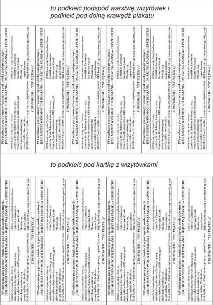 anita_happy Posted August 29, 2010 Posted August 29, 2010 tak siedziałam... pracowałam /wreszcie/ i WYMYŚLIŁAM :) mam nadzieje, że nie głupi pomysł... ale Dogomania jest już zapsiona i zresetowana finansowo... wiec trzeba uderzyć do szerszej masy ludzi - kontakt bezposredni przez zaprzyjaźnione lecznice... na tablicy u weta wieszamy plakat z podklejonymi wizytówkami z numerami kont i SZUKAMY WIRTUALNYCH OPIEKUNÓW PLAKAT I WIZYTÓWKI plakat link do wersji do druku http://i876.photobucket.com/albums/ab321/anita_happy/siodemka1.jpg wizytówki link do wersji do druku http://i876.photobucket.com/albums/ab321/anita_happy/siodemka2.jpg PYTANIE...czy podawanie numeru konta do hoteliku jest zgodne z prawem...nie ma tu jakiegoś przepisu o datkach i darowiznach ??? jesli tak - to trZEBA PODAĆ TYLKO FUNDACYJNE KONTO I tam kazdy okresli na jaką grupę psów chce wplacac.. oby wpłaty były Quote