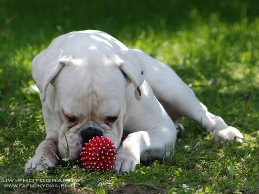 Bolsbokser Posted November 4, 2010 Posted November 4, 2010 To ja się pochwalę swoimi stratami i uroczym szkodnikiem To Albin - 3 letni głuchy bokser Początki były trudne, a zdolności niszczycielskie Albina wysoce rozwinięte. Oto jego zniszczenia: - zbite naczynia, uprzednio strącone z szafki - pozrzucane garnki z kuchenki - pozrzucane kurki od kuchenki - całe szczęście, że gazu nie odkręcił - kabel przepołowiony (zaznaczę, że wtyczka była wcześniej w kontakcie, ponieważ nic mu się nie stało, a wtyczka po powrocie do domu była poza gniazdem, musiał ją najpierw wyjąć, potem rozpracować) - TV zrzucony na podłogę - 500 zł naprawa - doniczki zrzucone, zbite, a kwiaty zjedzone - kosmetyczka - najwyraźniej znudził mu się biały kolor, bo dorwał się do mojej kosmetyczki. Kiedy wróciłam do domu, cały dywan był obsypany ziemią z kwiatków, a sam Albin wypaćkany tuszem do rzęs, błyszczykiem do ust i licznymi cieniami. Na dodatek spał słodko, jakby nigdy nic się nie stało. - obdrapane drzwi - bo przecież nie mógł znieść rozłąki - zjedzony kosz wiklinowy na bieliznę - wszelkie kartony rozerwane na strzępy - dodatkowo codziennie gigantyczna kałuża przy samym wejściu do domu - to był "miły" element powitania. Z czasem, gdy jego lęk separacyjny się nasilał, kałuże zaczęły pojawiać się na łóżku - wtedy doszłam do wniosku, że potrzebny jest behawiorysta. - pewnego dnia przewrócił dużą lampę stojącą, żarówka się zbiła i go pokaleczyła - innym razem tak szalał w domu, że naderwał sobie pazur - kiedy wróciłam z pracy, zastałam oprócz codziennej kałuży, drugą jednak krwistą. - potrafił wskakiwać na szafki podczas naszej nieobecności, oczywiście zrzucając wszystko, co napotkał pod łapą - zjedzona gąbka z fotela, na którym spał i wiele innych o podobnej treści zniszczeń. Oto mój słodki białasek :evil_lol: Jak go nie kochać ?? Problemy już takie nie występują, jednak musieliśmy się nauczyć odpowiednio z nim postępować, przeorganizować mieszkanie, no i częściej w domu jest porządek zachowany. Jednak nadal łatwo się stresuje, bo jak się okazało jest neurotycznym psem. Quote