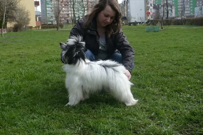a więc wystawka nam się bardzo udała, towarzystwo i sędzina super, pogoda nawet nawet. hihi stanęliśmy na drugiej lokacie, doskonały (na 4 psy) :) sędziowanie mi się baaaaaaaaardzo podobało, oby więcej takich ludzi jak p. Kuriata-Okarmus! była bardzo delikatna do psów, sympatyczna dla wystawców (chociaż wyśmiała mój grooming:D), każdy swój wybór tłumaczyła i dokładnie objaśniała. nie ustawiała na lokatach przy tabliczkach, tylko zbierała wszystkich razem do siebie i mówiła w stylu 'ten wygrał bo to, ten ma drugie miejsce bo to, ten ma 3 bo mi się nie podoba w nim to'. ogólnie spodziewałam się po Ulim lepszego zachowania:shake: chłopak był przestraszony i nie pokazywał się zbyt ładnie, jedyny postęp od ostatneij wystawy to taki że ustawiał się w miare okej, nie musiałam go przytrzymywać ciągle, na stoliku też nie najgorzej stał. ale ogonek do brzuszka przyklejony:shake: mimo to sędzinie się bardzo spodobał, powiedziała że to przepiękny pies, że jest jeszcze młody ale doskonale się rozwija i żeby jak najwięcej z nim jeździć na wystawy bo warto:loveu::loveu: do tego dodała, że zwycięstwo dzisiaj otrzymuje inny pies tylko dlatego że się ładniej pokazuje i jest starszy, no a też mu niczego nie brakuje. chyba narazie damy sobie spokój z posłuszeństwem i będziemy katować trening pod kątem wystaw, głowa mnie wczoraj bolała od ilu osób usłyszałam że to przepiękny pies ale lipe robi że się tak pokazuje i mase na tym traci...:shake: ja już nei wiem co z nim zroić:mad: najfajniejsze jest to, że po ocenie na ringu chodził z podniesionym ogonem, ćwiczyliśmy 'left', 'right', szaleliśmy:angryy::angryy::angryy::angryy: on mi to chyba normalnie na złość robi:mad: