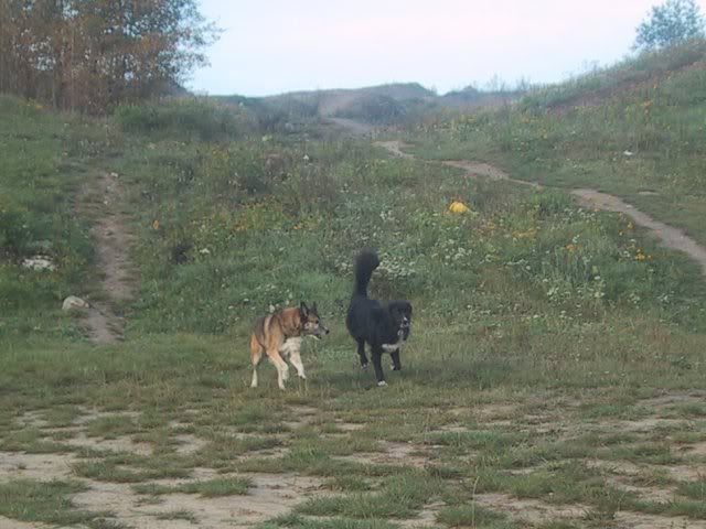 APSA Posted September 30, 2008 Author Posted September 30, 2008 Korzystając z nie najgorszej pogody i z tego, ze po pracy jest jeszcze widno, byłam dziś na spacerze z czteroPSakiem. Pomijając szczegóły, że dwa psy uparły się zaatakować jakiegoś ONka na przejściu dla pieszych, potem na łące jeden pogonił samochód straży miejskiej, potem jeden zginął, a jak się znalazł, to się okazało że nigdzie nie ma innego - to był bardzo udany spacer :loveu: Mieliśmy już wracać, kiedy wpadł na nas Piegus :) więc psy miały jeszcze kawałek spaceru. Szczęście, że nie było Morisa - gdyby tak Piegus na niego wpadł, byłaby jatka, oj by by się działo :diabloti: Zdjęcie nawet jedno mam, bardzo marne, ale nie przewidziałam potrzeby wzięcia aparatu ;) Quote