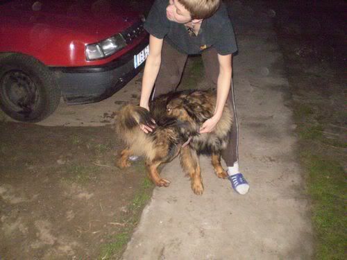 _ChiQuiTa_ Posted April 26, 2007 Author Posted April 26, 2007 Aaaa teraz Rudi:loveu: Uwielbiam go :iloveyou: a wręcz ubustwiam. Takie trasy z nim pokonywałam ze maskra, cały las obeszliśmy chyba hehe :) aaa i jeszcze jak jestem u cioci to robi za ochroniarza. Biega ze mną :D wieczorami :lol: :evil_lol: Niestety musi być na łańcuchu, bo jest bardzo silny i wszystkie smycze i sznurki przegrywa podonie jak Chester ale o nim za chwilę. Nie wiem czy na zdjeciach bedzie widać jakie okopy wykopał hehe :D:D Ale nie martwcie sie jest najszczęsliwszym psem na swiecie :) ta postać trzymająca Rudiego to moja zaje2bista ciocia :):) Quote